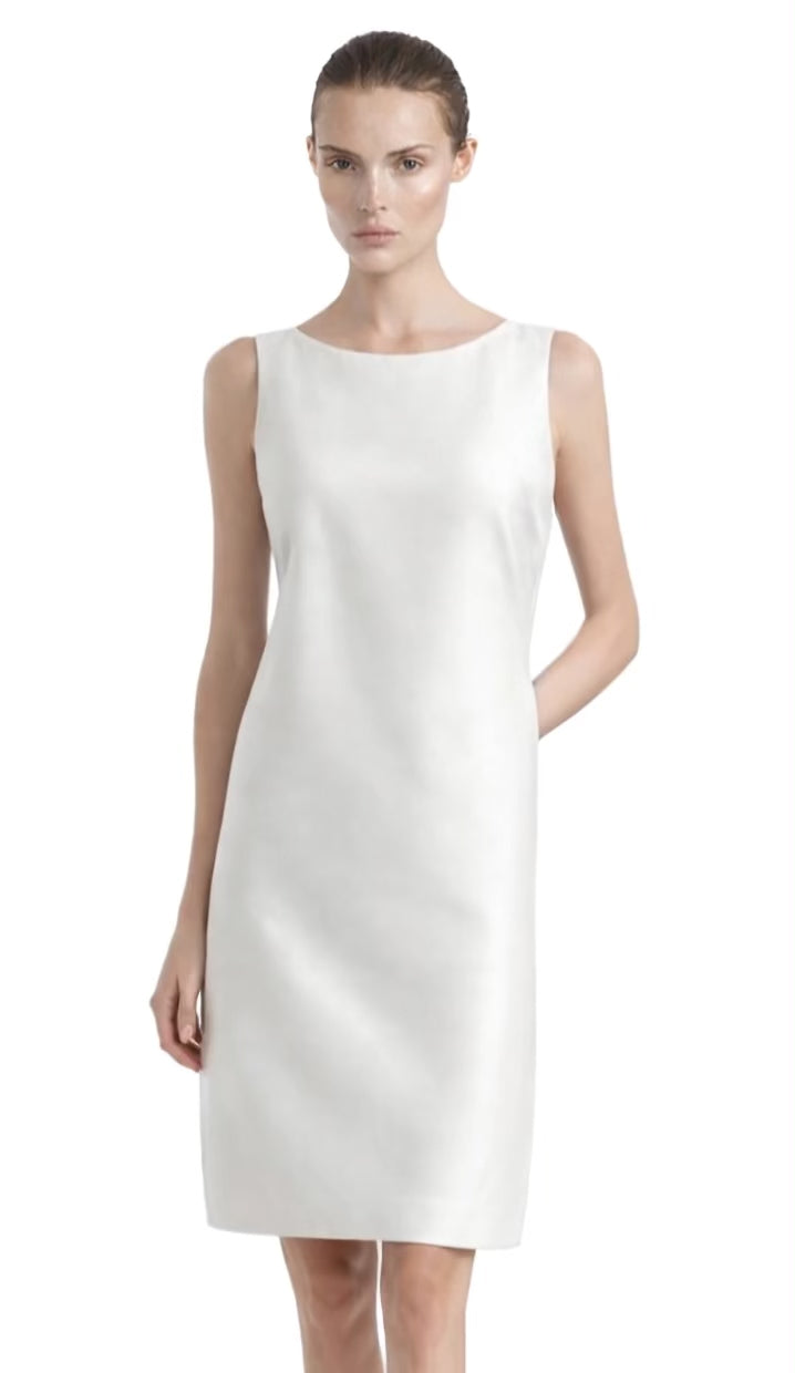 The Marina Blanche dress is cut in a straight, knee-length line with a sculpted neckline and tailoring that falls effortlessly from shoulder to hem.